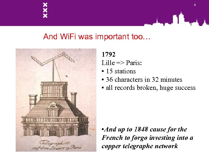 4 And Wi. Fi was important too… 1792 Lille => Paris: • 15 stations • 36 characters in 32 minutes • all records broken, huge success • And up to 1848 cause for the French to forgo investing into a copper telegraphe network