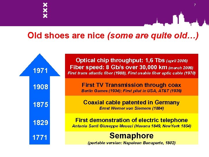 7 Old shoes are nice (some are quite old…) 1971 1908 Optical chip throughput: 1, 6 Tbs (april 2006) Fiber speed: 8 Gb/s over 30, 000 km (march 2006) First trans atlantic fiber (1988), First usable fiber optic cable (1970) First TV Transmission through coax Berlin Games (1934); First pilot in USA, AT&T (1936) 1875 Coaxial cable patented in Germany 1829 First demonstration of electric telephone Antonio Santi Giuseppe Meucci (Havana 1849, New. York 1854) 1771 Semaphore Ernst Werner von Siemens (1884) (portable version: Napoleon Bonaparte, 1802)