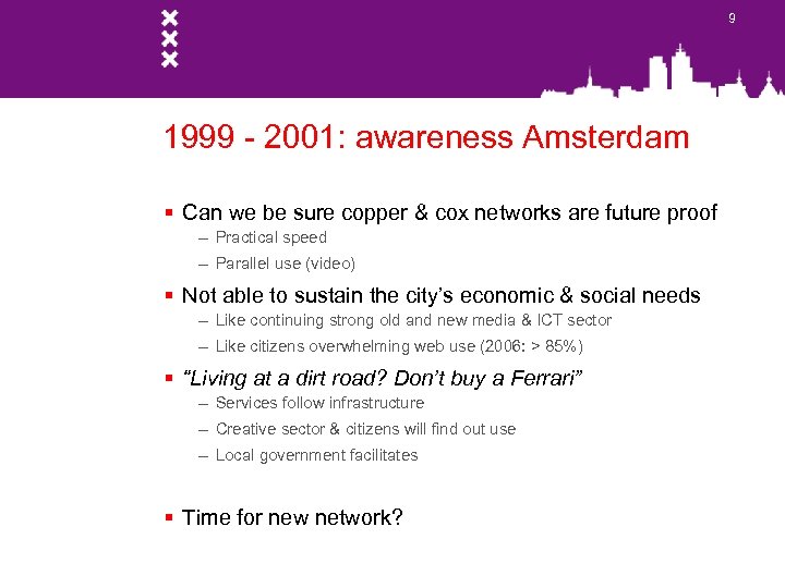 9 1999 - 2001: awareness Amsterdam § Can we be sure copper & cox networks are future proof – Practical speed – Parallel use (video) § Not able to sustain the city’s economic & social needs – Like continuing strong old and new media & ICT sector – Like citizens overwhelming web use (2006: > 85%) § “Living at a dirt road? Don’t buy a Ferrari” – Services follow infrastructure – Creative sector & citizens will find out use – Local government facilitates § Time for new network?