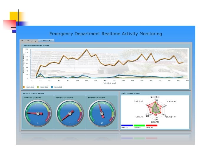 Real-time ED Monitoring and Control System n Data Collection n Collect real-time relevant information from hospital IT systems such as PACS, EHR, ADT, LAB etc Adding RFID based location tracking system for Physicians, Nurses, Patients and other relevant personnel Data Visualization n Operational dashboard n n n Displays complex behaviors in a simple way Mobile devices Analysis Techniques n n n Mathematical models – service engineering Simulations – for planning and control Machine learning - neural networks, based on historical data n Published paper (Med. Info 2010): MEDAL: Measuring of Emergency Departments Adaptive Load E. Vitkin, B. Carmeli, O. Greenshpan, D. Baras, Y. Marmor,