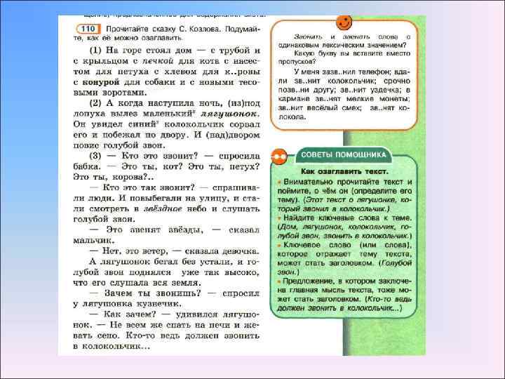 Советы помощника • • Как озаглавить текст Внимательно прочитайте текст и поймите, о чём он (определите его тему). Этот текст о лягушонке, который звонил в колокольчик. Найдите ключевые слова к теме. (Дом лягушонок, колокольчик, голубой звон, звонить в колокольчик. ) Ключевое слово (или слова), которое отражает тему текста, может стать заголовком. (Голубой звон. ) Предложение, в котором заключена главная мысль текста, тоже может стать заголовком. (Кто-то ведь должен звонить в колокольчик…)