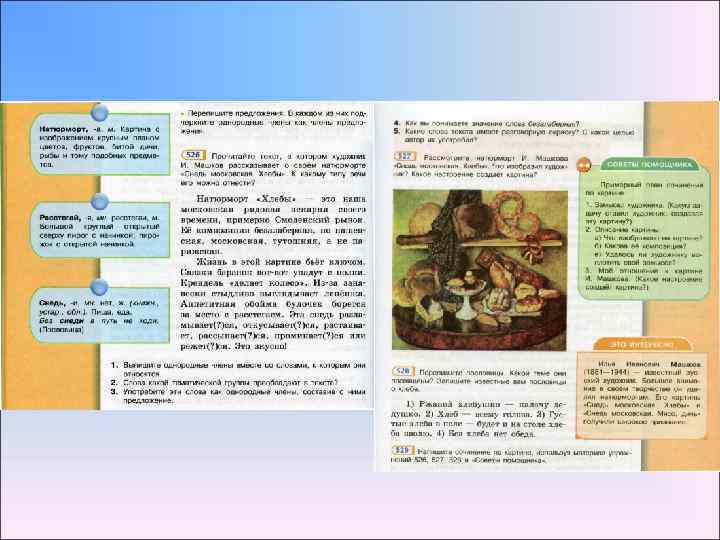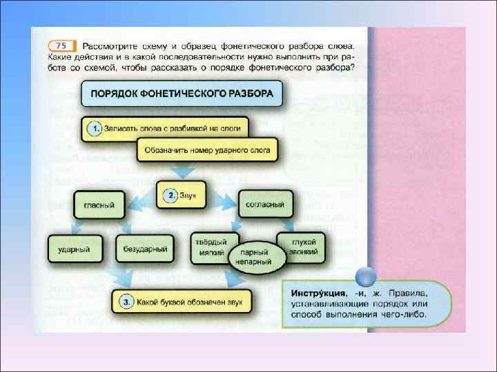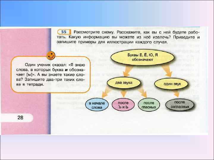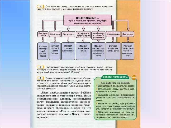 Работа со структурированной информацией Немаловажное значение в содержании учебника отводится работе со структурированной информацией. Здесь представлены разные графические решения схем и таблиц, алгоритмы решений лингвистических задач. Представляют новизну задания на перевод графического материала в словесную форму и наоборот.