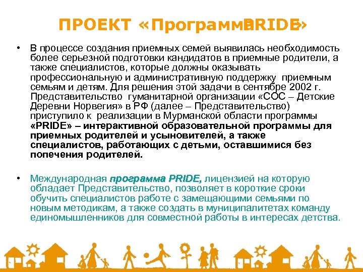 ПРОЕКТ «Программа PRIDE » • В процессе создания приемных семей выявилась необходимость более серьезной подготовки кандидатов в приемные родители, а также специалистов, которые должны оказывать профессиональную и административную поддержку приемным семьям и детям. Для решения этой задачи в сентябре 2002 г. Представительство гуманитарной организации «СОС – Детские Деревни Норвегия» в РФ (далее – Представительство) приступило к реализации в Мурманской области программы «PRIDE» – интерактивной образовательной программы для приемных родителей и усыновителей, а также специалистов, работающих с детьми, оставшимися без попечения родителей. • Международная программа PRIDE, лицензией на которую обладает Представительство, позволяет в короткие сроки обучить специалистов работе с замещающими семьями по новым методикам, а также создать в муниципалитетах команду единомышленников для совместной работы в интересах детства.