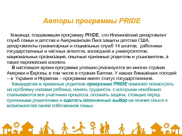Авторы программы PRIDE Команда, создававшая программу PRIDE, это Иллинойский департамент служб семьи и детства и Американская Лига защиты детства США, департаменты гуманитарных и социальных служб 14 штатов, работники государственных и частных агентств, колледжей и университетов, национальных организаций, опытные приемные родители и усыновители, а также европейские коллеги. В настоящее время программа успешно реализуется во многих странах Америки и Европы, в том числе в странах Балтии. У наших ближайших соседей – в Украине и Норвегии – программа имеет статус государственной. Кандидатам в приемные родители программа PRIDE помогает посмотреть на проблему глазами ребенка, понять трудности, с которыми неизбежно сталкиваются все участники процесса, осознать задачи, стоящие перед приемными родителями и сделать осознанный выбор на основе опыта и возможностей своей собственной семьи.