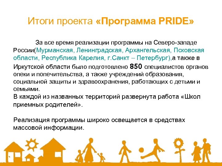 Итоги проекта «Программа PRIDE» За все время реализации программы на Северо-западе России(Мурманская, Ленинградская, Архангельская, Псковская области, Республика Карелия, г. Санкт – Петербург), а также в Иркутской области было подготовлено 850 специалистов органов опеки и попечительства, а также учреждений образования, социальной защиты и здравоохранения, работающих с детьми и семьями. В каждой из названных территорий развернута работа «Школ приемных родителей» . Реализация программы широко освещается в средствах массовой информации.