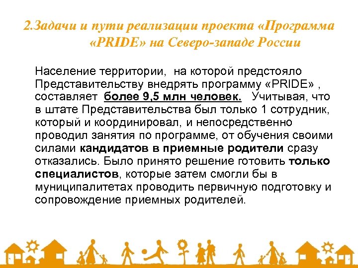 2. Задачи и пути реализации проекта «Программа «PRIDE» на Северо-западе России Население территории, на которой предстояло Представительству внедрять программу «PRIDE» , составляет более 9, 5 млн человек. Учитывая, что в штате Представительства был только 1 сотрудник, который и координировал, и непосредственно проводил занятия по программе, от обучения своими силами кандидатов в приемные родители сразу отказались. Было принято решение готовить только специалистов, которые затем смогли бы в муниципалитетах проводить первичную подготовку и сопровождение приемных родителей.