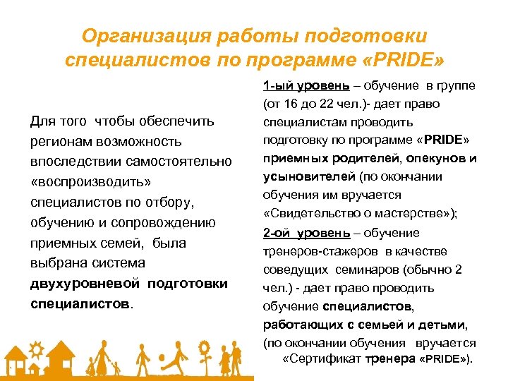 Организация работы подготовки специалистов по программе «PRIDE» Для того чтобы обеспечить регионам возможность впоследствии самостоятельно «воспроизводить» специалистов по отбору, обучению и сопровождению приемных семей, была выбрана система двухуровневой подготовки специалистов. 1 -ый уровень – обучение в группе (от 16 до 22 чел. )- дает право специалистам проводить подготовку по программе «PRIDE» приемных родителей, опекунов и усыновителей (по окончании обучения им вручается «Свидетельство о мастерстве» ); 2 -ой уровень – обучение тренеров-стажеров в качестве соведущих семинаров (обычно 2 чел. ) - дает право проводить обучение специалистов, работающих с семьей и детьми, (по окончании обучения вручается «Сертификат тренера «PRIDE» ).