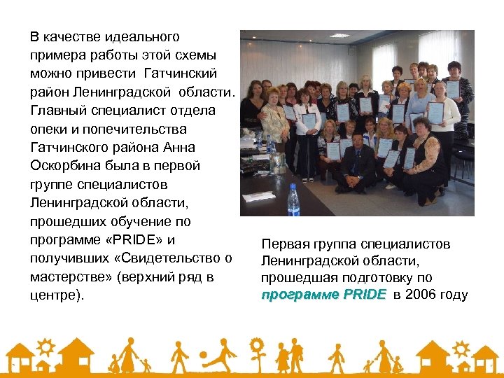 В качестве идеального примера работы этой схемы можно привести Гатчинский район Ленинградской области. Главный специалист отдела опеки и попечительства Гатчинского района Анна Оскорбина была в первой группе специалистов Ленинградской области, прошедших обучение по программе «PRIDE» и получивших «Свидетельство о мастерстве» (верхний ряд в центре). Первая группа специалистов Ленинградской области, прошедшая подготовку по программе PRIDE в 2006 году