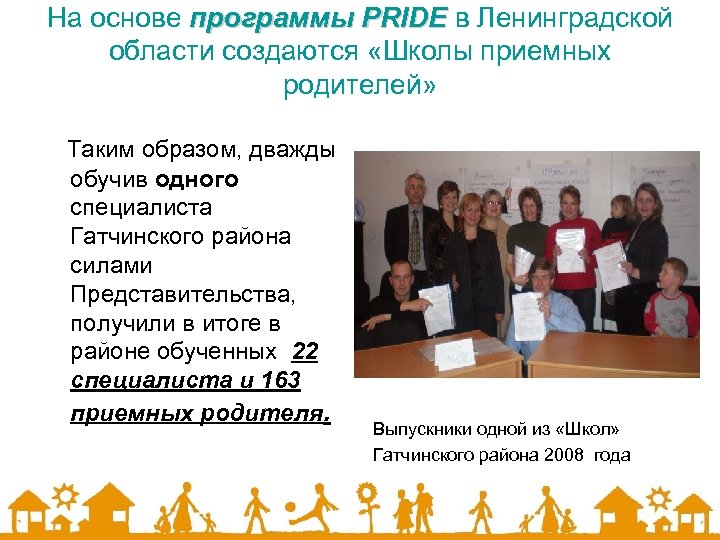 На основе программы PRIDE в Ленинградской области создаются «Школы приемных родителей» Таким образом, дважды обучив одного специалиста Гатчинского района силами Представительства, получили в итоге в районе обученных 22 специалиста и 163 приемных родителя. Выпускники одной из «Школ» Гатчинского района 2008 года