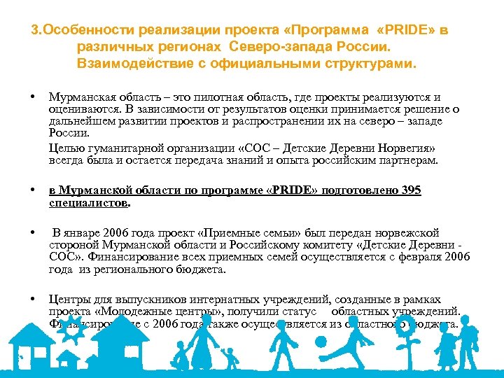 3. Особенности реализации проекта «Программа «PRIDE» в различных регионах Северо-запада России. Взаимодействие с официальными структурами. • Мурманская область – это пилотная область, где проекты реализуются и оцениваются. В зависимости от результатов оценки принимается решение о дальнейшем развитии проектов и распространении их на северо – западе России. Целью гуманитарной организации «СОС – Детские Деревни Норвегия» всегда была и остается передача знаний и опыта российским партнерам. • в Мурманской области по программе «PRIDE» подготовлено 395 специалистов. • В январе 2006 года проект «Приемные семьи» был передан норвежской стороной Мурманской области и Российскому комитету «Детские Деревни СОС» . Финансирование всех приемных семей осуществляется с февраля 2006 года из регионального бюджета. • Центры для выпускников интернатных учреждений, созданные в рамках проекта «Молодежные центры» , получили статус областных учреждений. Финансирование с 2006 года также осуществляется из областного бюджета.