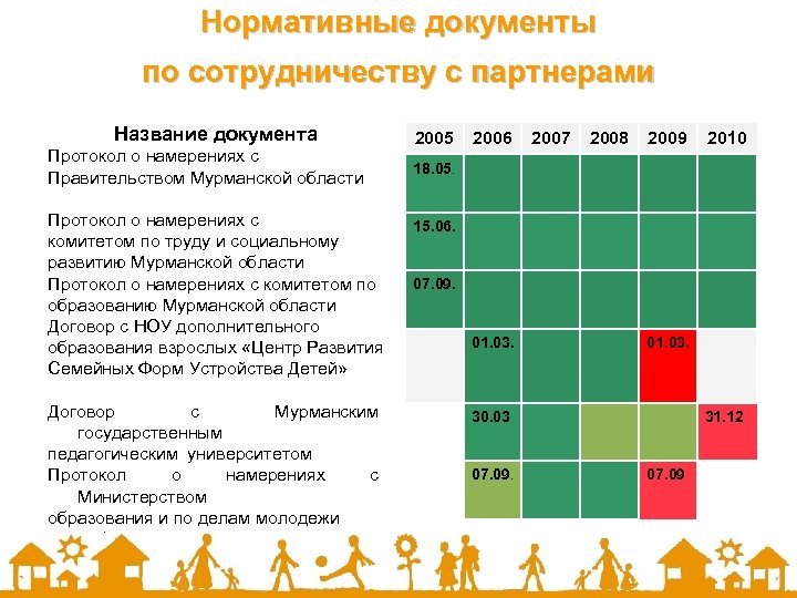 Нормативные документы по сотрудничеству с партнерами Название документа Протокол о намерениях с Правительством Мурманской области Протокол о намерениях с комитетом по труду и социальному развитию Мурманской области Протокол о намерениях с комитетом по образованию Мурманской области Договор с НОУ дополнительного образования взрослых «Центр Развития Семейных Форм Устройства Детей» Договор с Мурманским государственным педагогическим университетом Протокол о намерениях с Министерством образования и по делам молодежи Республики Карелия 2005 2006 2007 2008 2009 2010 18. 05. 15. 06. 07. 09. 01. 03. 30. 03 07. 09. 31. 12 07. 09