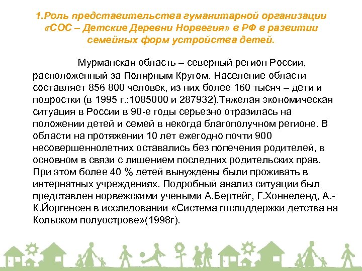 1. Роль представительства гуманитарной организации «СОС – Детские Деревни Норвегия» в РФ в развитии семейных форм устройства детей. Мурманская область – северный регион России, расположенный за Полярным Кругом. Население области составляет 856 800 человек, из них более 160 тысяч – дети и подростки (в 1995 г. : 1085000 и 287932). Тяжелая экономическая ситуация в России в 90 -е годы серьезно отразилась на положении детей и семей в некогда благополучном регионе. В области на протяжении 10 лет ежегодно почти 900 несовершеннолетних оставались без попечения родителей, в основном в связи с лишением последних родительских прав. При этом более 40 % детей вынуждены были проживать в интернатных учреждениях. Подробный анализ ситуации был представлен норвежскими учеными А. Бертейг, Г. Хоннеленд, А. К. Йоргенсен в исследовании «Система господдержки детства на Кольском полуострове» (1998 г).