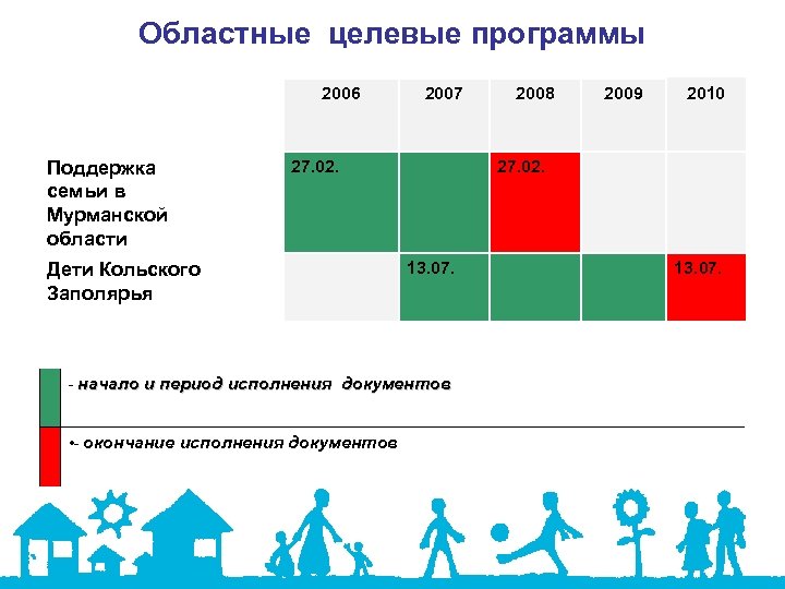 Областные целевые программы 2006 Поддержка семьи в Мурманской области 2007 27. 02. Дети Кольского Заполярья 2009 2010 27. 02. 13. 07. - начало и период исполнения документов • - окончание исполнения документов 2008 13. 07.