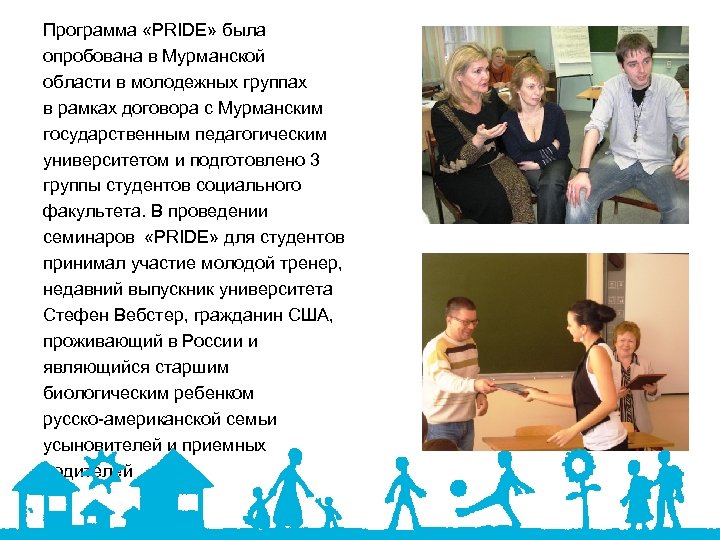 Программа «PRIDE» была опробована в Мурманской области в молодежных группах в рамках договора с Мурманским государственным педагогическим университетом и подготовлено 3 группы студентов социального факультета. В проведении семинаров «PRIDE» для студентов принимал участие молодой тренер, недавний выпускник университета Стефен Вебстер, гражданин США, проживающий в России и являющийся старшим биологическим ребенком русско-американской семьи усыновителей и приемных родителей