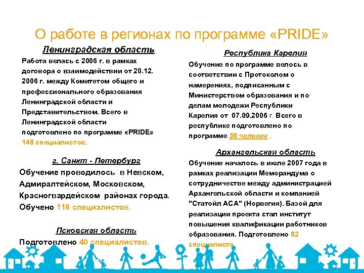 О работе в регионах по программе «PRIDE» Ленинградская область Работа велась с 2006 г. в рамках договора о взаимодействии от 20. 12. 2006 г. между Комитетом общего и профессионального образования Ленинградской области и Представительством. Всего в Ленинградской области подготовлено по программе «PRIDE» 148 специалистов. г. Санкт - Петербург Обучение проводилось в Невском, Адмиралтейском, Московском, Красногвардейском районах города. Обучено 116 специалистов. Псковская область Подготовлено 40 специалистов. Республика Карелия Обучение по программе велось в соответствии с Протоколом о намерениях, подписанным с Министерством образования и по делам молодежи Республики Карелия от 07. 09. 2006 г. Всего в республике подготовлено по программе 56 человек. Архангельская область Обучение началось в июле 2007 года в рамках реализации Меморандума о сотрудничестве между администрацией Архангельской области и компанией "Статойл АСА" (Норвегия). Базой для реализации проекта стал институт повышения квалификации работников образования. Подготовлено 82 специалиста.