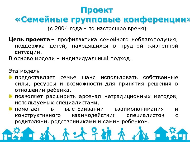 Проект «Семейные групповые конференции» (с 2004 года - по настоящее время) Цель проекта – профилактика семейного неблагополучия, поддержка детей, находящихся в трудной жизненной ситуации. В основе модели – индивидуальный подход. Эта модель предоставляет семье шанс использовать собственные силы, ресурсы и возможности для принятия решения в отношении ребенка, позволяет расширить арсенал нетрадиционных методов, используемых специалистами, помогает в выстраивании взаимопонимания и конструктивного взаимодействия специалистов с родителями, родственниками и самим ребенком.