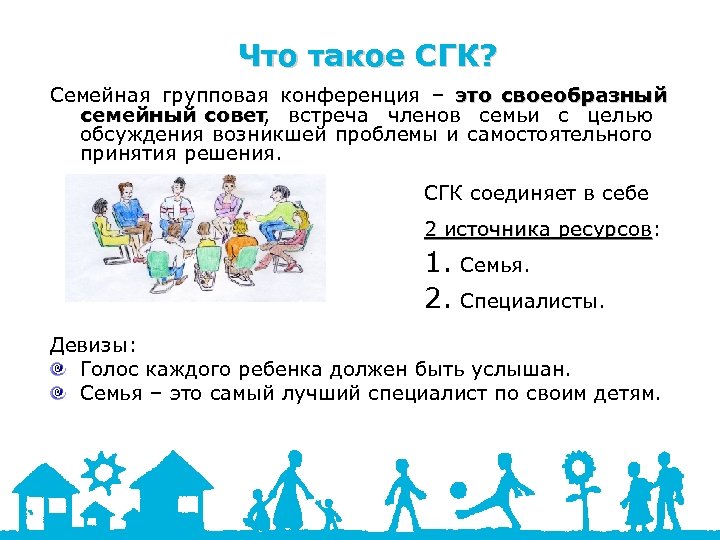 . Что такое СГК? Семейная групповая конференция – это своеобразный семейный совет встреча членов семьи с целью , обсуждения возникшей проблемы и самостоятельного принятия решения. СГК соединяет в себе 2 источника ресурсов: ресурсов 1. Семья. 2. Специалисты. Девизы: Голос каждого ребенка должен быть услышан. Семья – это самый лучший специалист по своим детям.
