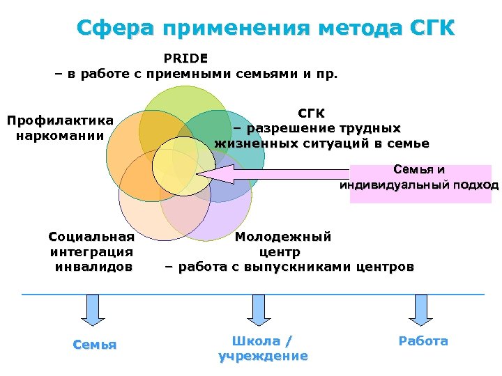 Сфера применения метода СГК PRIDE – в работе с приемными семьями и пр. Профилактика наркомании СГК – разрешение трудных жизненных ситуаций в семье Семья и индивидуальный подход Социальная интеграция инвалидов Семья Молодежный центр – работа с выпускниками центров Школа / учреждение Работа