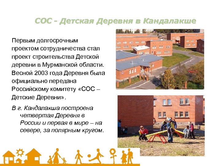 COC - Детская Деревня в Кандалакше Первым долгосрочным проектом сотрудничества стал проект строительства Детской деревни в Мурманской области. Весной 2003 года Деревня была официально передана Российскому комитету «СОС – Детские Деревни» . В г. Кандалакша построена четвертая Деревня в России и первая в мире – на севере, за полярным кругом.