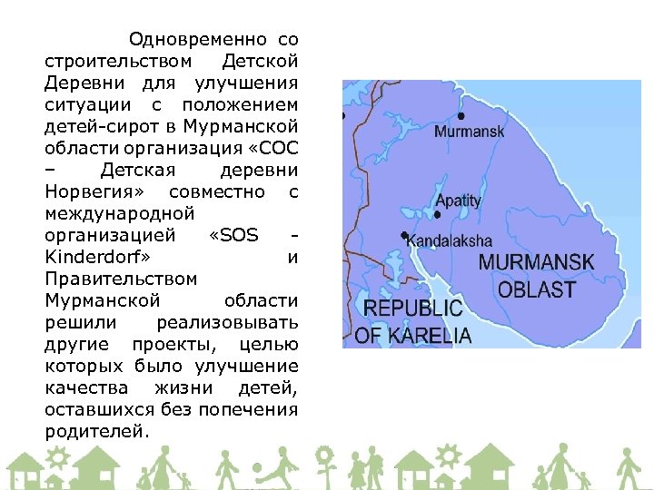 Одновременно со строительством Детской Деревни для улучшения ситуации с положением детей-сирот в Мурманской области организация «СОС – Детская деревни Норвегия» совместно с международной организацией «SOS Kinderdorf» и Правительством Мурманской области решили реализовывать другие проекты, целью которых было улучшение качества жизни детей, оставшихся без попечения родителей.