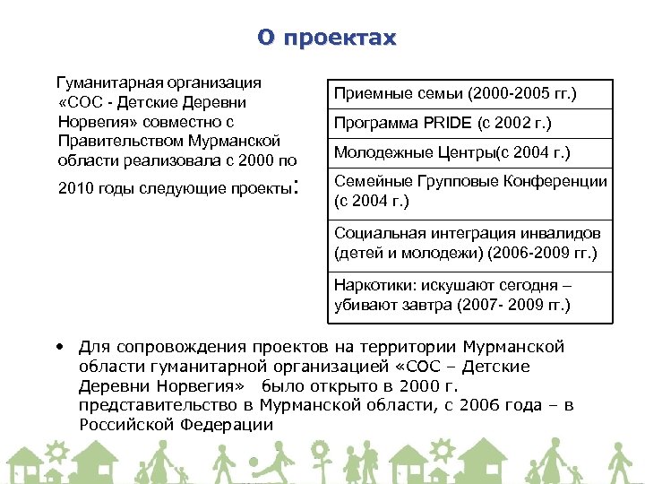 О проектах Гуманитарная организация «СОС - Детские Деревни Норвегия» совместно с Правительством Мурманской области реализовала с 2000 по 2010 годы следующие проекты: Приемные семьи (2000 -2005 гг. ) Программа PRIDE (с 2002 г. ) Молодежные Центры(с 2004 г. ) Семейные Групповые Конференции (с 2004 г. ) Социальная интеграция инвалидов (детей и молодежи) (2006 -2009 гг. ) Наркотики: искушают сегодня – убивают завтра (2007 - 2009 гг. ) • Для сопровождения проектов на территории Мурманской области гуманитарной организацией «СОС – Детские Деревни Норвегия» было открыто в 2000 г. представительство в Мурманской области, с 2006 года – в Российской Федерации
