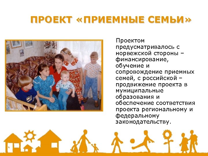 ПРОЕКТ «ПРИЕМНЫЕ СЕМЬИ» Проектом предусматривалось с норвежской стороны – финансирование, обучение и сопровождение приемных семей, с российской – продвижение проекта в муниципальные образования и обеспечение соответствия проекта региональному и федеральному законодательству.