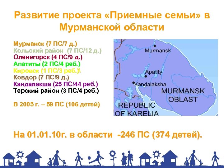 Развитие проекта «Приемные семьи» в Мурманской области Мурманск (7 ПС/7 д. ) Кольский район (7 ПС/12 д. ) Оленегорск (4 ПС/9 д. ) Апатиты (2 ПС/4 реб. ) Кировск (1 ПС/3 реб. ) Ковдор (7 ПС/9 д. ) Кандалакша (25 ПС/44 реб. ) Терский район (3 ПС/4 реб. ) В 2005 г. – 59 ПС (106 детей) На 01. 10 г. в области -246 ПС (374 детей).