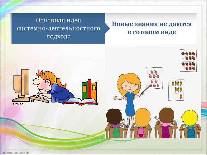 Базовые принципы системно - деятельностного подхода Принцип деятельности Ученик: • получает знания не в готовом виде, а добывает их сам; • осознает содержание и формы своей учебной деятельности; • понимает и принимает систему норм учебной деятельности, активно участвует в их совершенствовании.