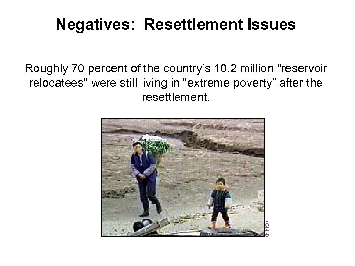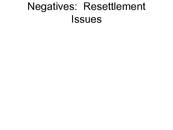 Negatives: Resettlement Issues Roughly 70 percent of the country’s 10. 2 million "reservoir relocatees" were still living in "extreme poverty” after the resettlement.