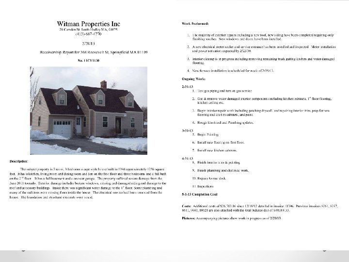 CONTENT Reports & Reviews Keep the report brief with details attached. In One Minute: • Describe property o Type – Single, Multi, Building o How did the receivership start? • Direction of the Project • Costs to Date • Attach Supporting Documentation & Exhibits o Work Performed o Planned Work o Is it going according to plan? o All costs to date o Projected Costs