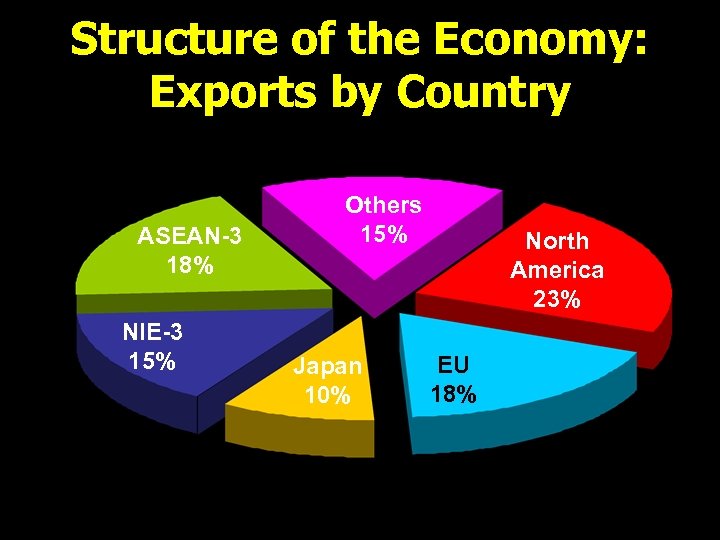 Structure of the Economy: Exports by Country ASEAN-3 18% NIE-3 15% Others 15% Japan 10% North America 23% EU 18%