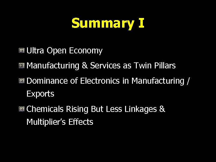 Summary I Ultra Open Economy Manufacturing & Services as Twin Pillars Dominance of Electronics in Manufacturing / Exports Chemicals Rising But Less Linkages & Multiplier’s Effects