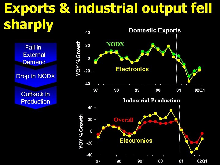 Exports & industrial output fell sharply Domestic Exports Fall in External Demand NODX Electronics Drop in NODX Cutback in Production Industrial Production Overall Electronics