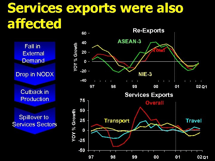 Services exports were also affected Re-Exports Fall in External Demand ASEAN-3 Total Drop in NODX Cutback in Production Spillover to Services Sectors NIE-3 Q 1 Services Exports Overall Transport Travel Q 1