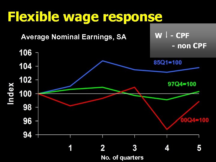 Flexible wage response Average Nominal Earnings, SA W - CPF - non CPF 85 Q 1=100 97 Q 4=100 00 Q 4=100 No. of quarters