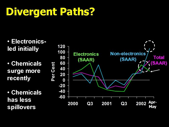 Divergent Paths? • Electronicsled initially • Chemicals surge more recently • Chemicals has less spillovers Electronics (SAAR) Non-electronics (SAAR) Total (SAAR) Apr. May