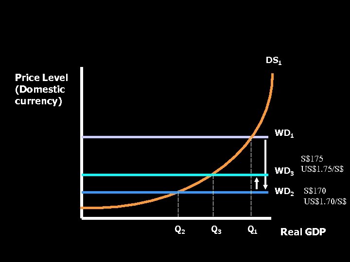 World Demand-Domestic Supply Curve DS 1 Price Level (Domestic currency) WD 1 WD 3 WD 2 Q 3 Q 1 S$175 US$1. 75/S$ S$170 US$1. 70/S$ Real GDP