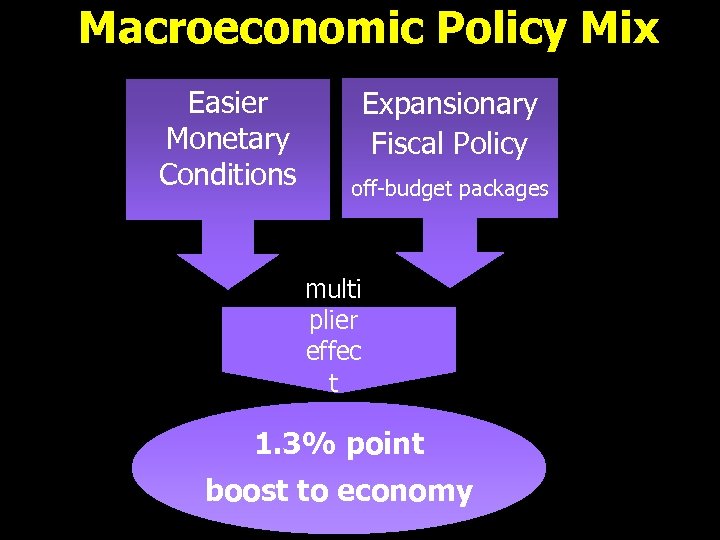 Macroeconomic Policy Mix Easier Monetary Conditions Expansionary Fiscal Policy off-budget packages multi plier effec t 1. 3% point boost to economy