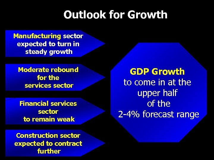 Outlook for Growth Manufacturing sector expected to turn in steady growth Moderate rebound for the services sector Financial services sector to remain weak Construction sector expected to contract further GDP Growth to come in at the upper half of the 2 -4% forecast range