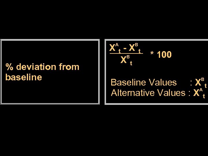 A % deviation from baseline Xt-X B Xt B t * 100 B Baseline Values : X t A Alternative Values : X t
