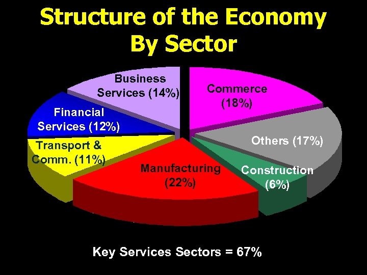 Structure of the Economy By Sector Business Services (14%) Financial Services (12%) Transport & Comm. (11%) Commerce (18%) Others (17%) Manufacturing (22%) Construction (6%) Key Services Sectors = 67%
