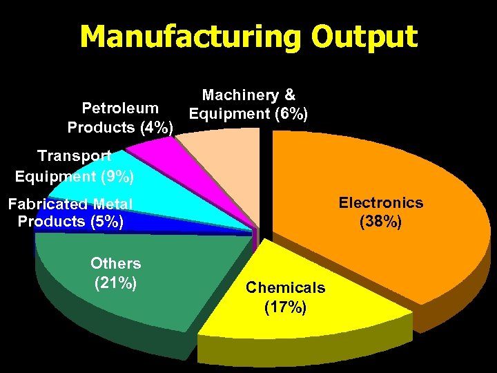 Manufacturing Output Petroleum Products (4%) Machinery & Equipment (6%) Transport Equipment (9%) Electronics (38%) Fabricated Metal Products (5%) Others (21%) Chemicals (17%)