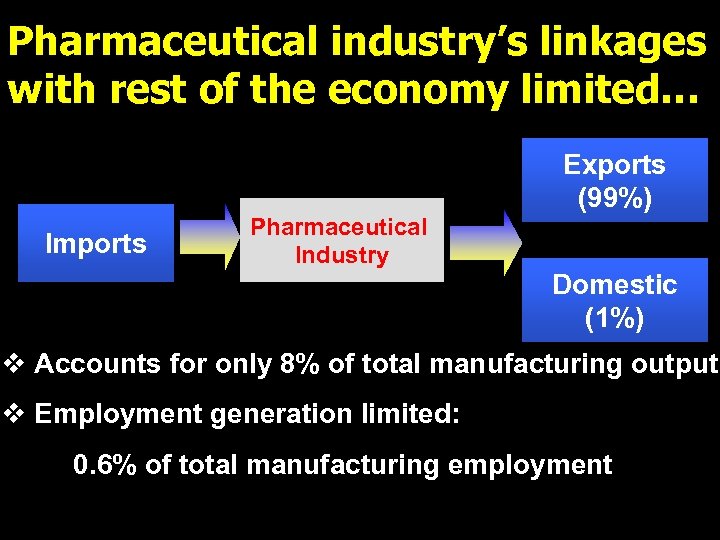 Pharmaceutical industry’s linkages with rest of the economy limited… Imports Pharmaceutical Industry Exports (99%) Domestic (1%) v Accounts for only 8% of total manufacturing output v Employment generation limited: 0. 6% of total manufacturing employment