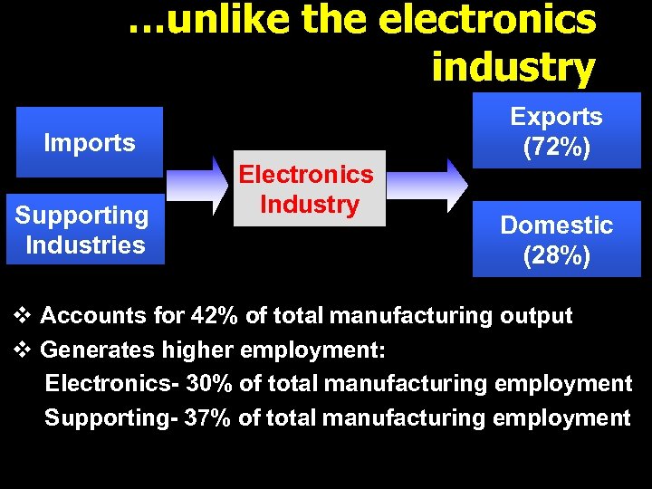 …unlike the electronics industry Imports Supporting Industries Electronics Industry Exports (72%) Domestic (28%) v Accounts for 42% of total manufacturing output v Generates higher employment: Electronics- 30% of total manufacturing employment Supporting- 37% of total manufacturing employment