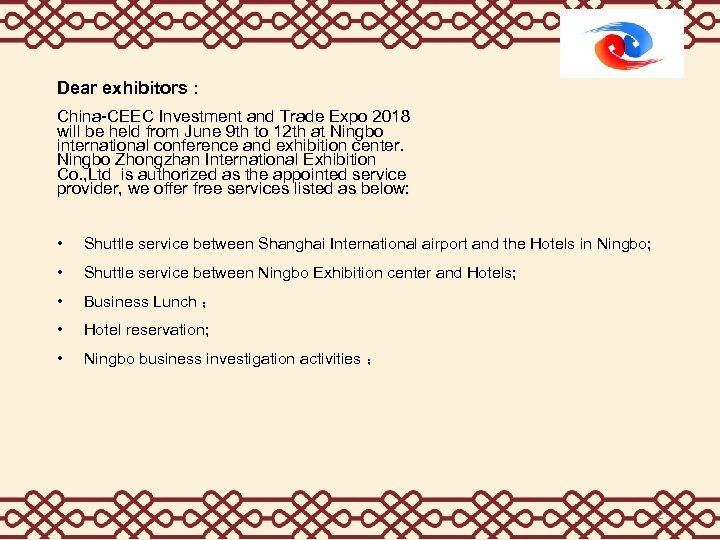Dear exhibitors : China-CEEC Investment and Trade Expo 2018 will be held from June 9 th to 12 th at Ningbo international conference and exhibition center. Ningbo Zhongzhan International Exhibition Co. , Ltd is authorized as the appointed service provider, we offer free services listed as below: • Shuttle service between Shanghai International airport and the Hotels in Ningbo; • Shuttle service between Ningbo Exhibition center and Hotels; • Business Lunch ; • Hotel reservation; • Ningbo business investigation activities ; 2