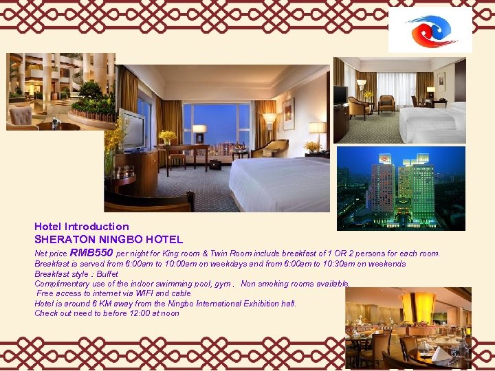. Hotel Introduction SHERATON NINGBO HOTEL Net price RMB 550 per night for King room & Twin Room include breakfast of 1 OR 2 persons for each room. Breakfast is served from 6: 00 am to 10: 00 am on weekdays and from 6: 00 am to 10: 30 am on weekends Breakfast style:Buffet Complimentary use of the indoor swimming pool, gym ,Non smoking rooms available, Free access to internet via WIFI and cable Hotel is around 6 KM away from the Ningbo International Exhibition hall. Check out need to before 12: 00 at noon 5