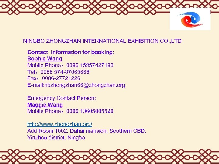 NINGBO ZHONGZHAN INTERNATIONAL EXHIBITION CO. , LTD Contact information for booking: Sophie Wang Mobile Phone: 0086 15957427180 Tel: 0086 574 -87065668 Fax: 0086 -27721226 E-mail: nbzhongzhan 66@zhongzhan. org Emergency Contact Person: Maggie Wang Mobile Phone: 0086 13605885528 http: //www. zhongzhan. org/ Add: Room 1002, Dahai mansion, Southern CBD, Yinzhou district, Ningbo 8