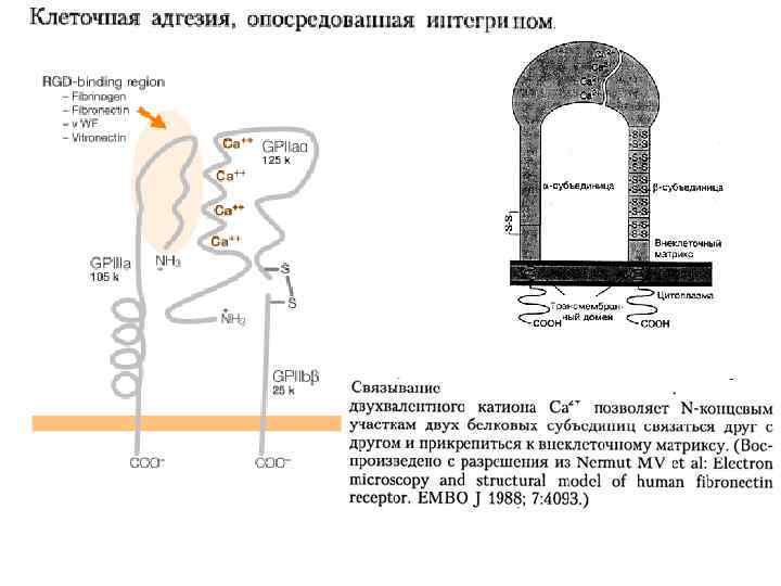Рецептор фибронектина. Каждая субъединица имеет Øединственный трансмембранный домен, Øкороткий цитоплазматический Øпротяжённый N-внеклеточный домены. Обе субъединицы (α, β) интегрина гликозилированы и удерживаются вместе нековалентными связями, α-Субъединица синтезируется в виде одной полипептидной цепи, затем расщепляемой на малую трансмембранную цепь и большую внеклеточную цепь, соединённые дисульфидными мостиками. β-Субъединица содержит 4 повтора из 40 аминокислотных остатков каждый. Связываясь с фибронектином снаружи и с цитоскелетом внутри клетки, интегрин действует как трансмембранный линкер.