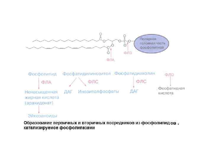 ВИДЫ ФОСФОЛИПАЗ А PL 1 – гидролиз эфирной связи в положении 1 (отщепляет SN-1 ацильную цепь). А PLС – гидролиз эфирной связи в положении 3 (гидролизует связь между глицериновым остатком фосфолипида и полярной фосфатной группой) PLD - гидролизует связь между фосфатной группой и спиртовой группой PL 2 – гидролиз эфирной связи в положении 2 (отщепляет SN-2 ацильную цепь, образование свободных жирных кислот)