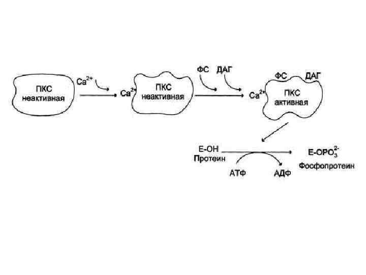Протеинкиназа С R состоит из двух доменов – регуляторного (R) и каталитического (C) С 2 Zn 2+ Каталитический домен: центр, связывающий АТФ и белок-субстрат. Са 2+ АТФ Белоксубстрат Неактивная протеинкиназа С – цитозольная, при активации становится мембранносвязанной ДАГ Регуляторный домен: мотив цинковые пальцы и участок с высоким сродством к Са 2+